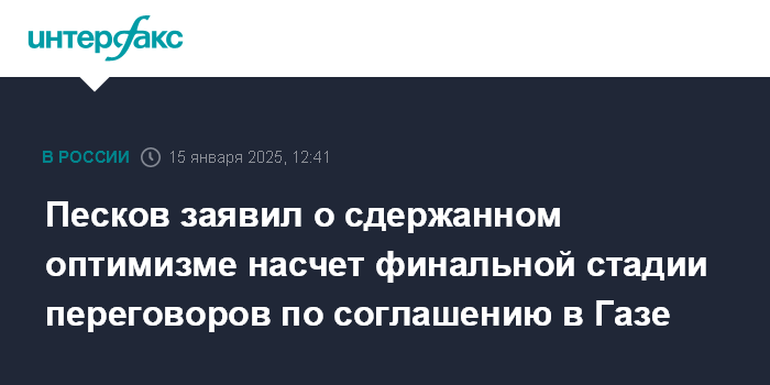 Москва. 15 января. INTERFAX.RU - В Москве со сдержанным оптимизмом восприняли сообщения о том, что переговоры по мирному соглашению в Газе находятся в финальной стадии, заявил пресс-секретарь президента РФ Дмитрий Песков.