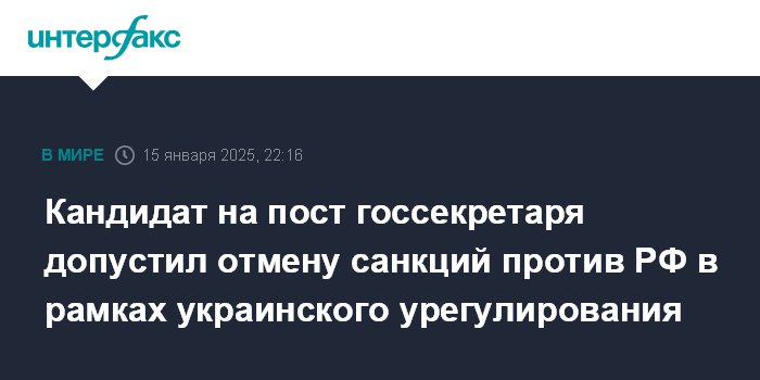 Москва. 15 января. INTERFAX.RU - При украинском урегулировании можно будет рассмотреть и вопрос об отмене санкций против РФ, предположил в среду кандидат на пост госсекретаря США Марко Рубио.