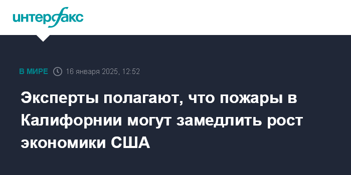 Москва. 16 января. INTERFAX.RU - Разрушительные лесные пожары, охватившие Калифорнию в этом году, могут замедлить рост экономики США и снижение темпов инфляции, пишет Market Watch, ссылаясь на мнение экономистов.