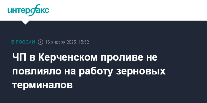 Москва. 16 января. INTERFAX.RU - Разлив мазута в Керченском проливе не повлиял на работу черноморских зерновых терминалов, которые являются ведущими перевалочными мощностями России. Резкое снижение экспорта зерна из РФ, которое отмечено в начале января, произошло по другим причинам, заявили специалисты, опрошенные "Интерфаксом".
