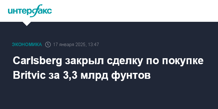 Москва. 17 января. INTERFAX.RU - Пивоваренный концерн Carlsberg закрыл сделку по приобретению британского производителя безалкогольных напитков Britvic за 3,3 млрд фунтов стерлингов ($4,03 млрд) после получения одобрения от Высокого суда Лондона.