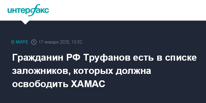 Москва. 17 января. INTERFAX.RU - Россиянин Александр Труфанов фигурирует в списке 33 заложников, которых планируется освободить в ходе первого этапа соглашения о прекращении огня в секторе Газа, заключенного между Израилем и радикальной группировкой ХАМАС.