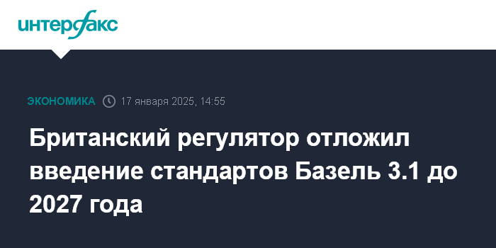Москва. 17 января. INTERFAX.RU - Управление пруденциального регулирования Великобритании (Prudential Regulation Authority, PRA) отложило еще на год - до 1 января 2027 года - введение стандартов Базель 3.1 для финансовых институтов.