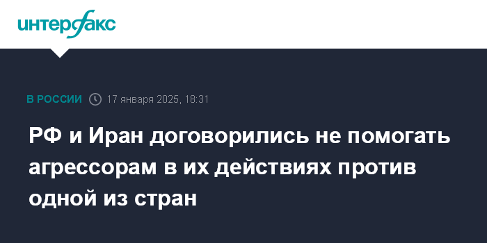 Москва. 17 января. INTERFAX.RU - Россия и Иран договорились, что в случае агрессии в отношении одной из этих стран, другая не будет оказывать помощь агрессору, сообщает сайт Кремля.