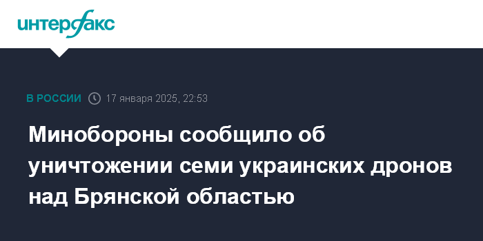 "17 января т.г. в период с 21:10 до 21:45 мск дежурными средствами ПВО уничтожены семь украинских беспилотных летательных аппаратов над территорией Брянской области", - говорится в сообщении Минобороны РФ.