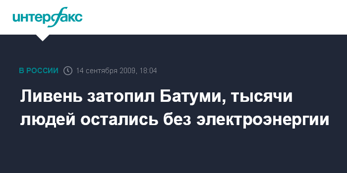 Москва. 14 сентября. INTERFAX.RU - Сильный ливень, который в понедельник в течение 40 минут продолжался в Батуми, вызвал наводнение почти во всем городе. Как сообщает телекомпания "Рустави-2", в результате проливного дождя уровень воды на улицах Батуми поднялся до полуметра, оказались затопленными улицы и подвалы домов. "Вода затопила почти все районы города. В результате наводнения отключилась местная электроподстанция, и пять тыс. абонентов остались без электроэнергии", - сообщает телекомпания. По словам мэра Батуми Роберта Чхаидзе, мобилизованы все городские службы и в настоящее время идет работа по откачке воды.