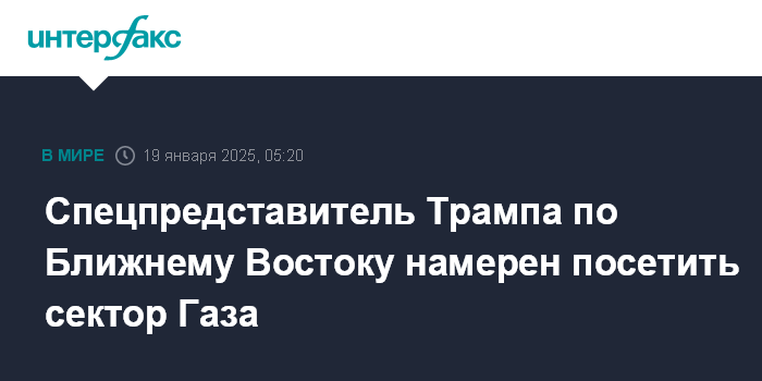 Москва. 19 января. INTERFAX.RU - Стив Уиткофф, назначенный избранным президентом США Дональдом Трампом спецпредставителем по Ближнему Востоку, планирует посетить сектор Газа в рамках контроля над соглашением по заложникам и прекращению огня, сообщил телеканал NBC со ссылкой на информированные источники.
