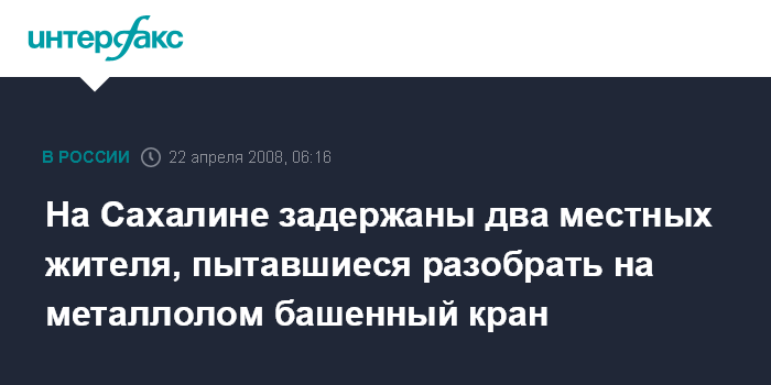 Как сообщил во вторник агентству "Интерфакс-Дальний Восток" начальник штаба областного ЛУВДТ Александр Кашпурович, в Макаровском районе на тупиковой железнодорожной ветке станции Туманово милиционеры задержали двоих местных безработных жителей 23 и 25 лет, которые пытались разобрать на металлолом башенный кран СахЖД.