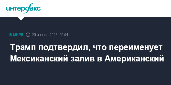 Москва. 20 января. INTERFAX.RU - Президент США Дональд Трамп, выступая в понедельник с инаугурационной речью на Капитолийском холме, подтвердил намерение переименовать Мексиканский залив в Американский.