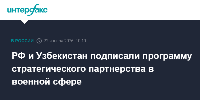 Москва. 22 января. INTERFAX.RU - План сотрудничества между министерствами обороны России и Узбекистана на 2025 год и программа стратегического партнерства между двумя странами в военной области на 2026-2030 годы подписаны в среду в Ташкенте.