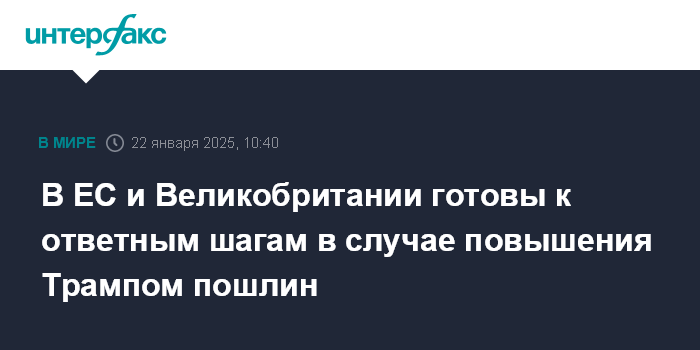 Москва. 22 января. INTERFAX.RU - В Брюсселе и Лондоне подготовили ответные шаги на случай, если администрация президента США Дональда Трампа решит повысить пошлины на товары из ЕС и Великобритании, сообщает в среду издание Politico.