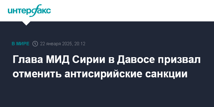 Москва. 22 января. INTERFAX.RU - Глава сирийского МИД Асаад Хасан аш-Шибани призвал отменить экономические санкции против Сирии. Он заявил об этом на Всемирном экономическом форуме в Давосе.