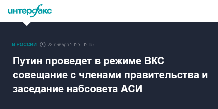 Москва. 23 января. INTERFAX.RU - Президент РФ Владимир Путин в четверг в формате видеоконференцсвязи проведет совещание с членами правительства РФ и заседание набсовета АСИ, сообщила пресс-служба Кремля.