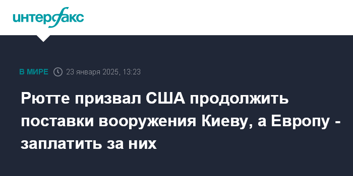 Москва. 23 января. INTERFAX.RU - Генсек НАТО Марк Рютте в четверг заявил, что европейские страны будут должны заплатить за вооружение, если США продолжат его поставки Украине, сообщают европейские СМИ.