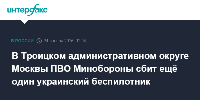 Москва. 24 января. INTERFAX.RU - Силы ПВО сбили еще один дрон ВСУ в Троицком административном округе, сообщил мэр Москвы Сергей Собянин.
