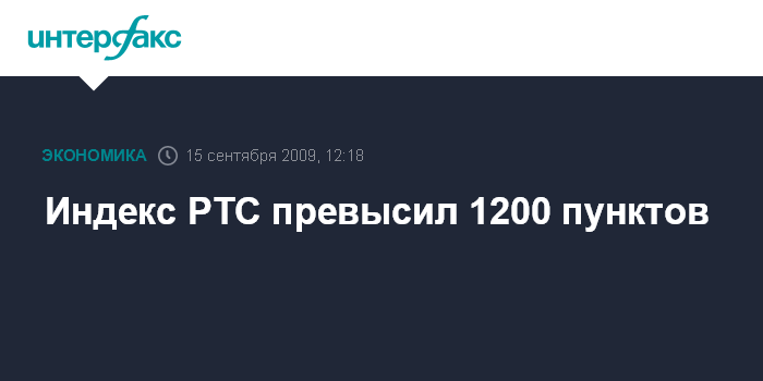 Москва. 15 сентября. INTERFAX.RU - Индекс РТС, один из основных российских фондовых индикаторов, утром во вторник превысил 1200 пунктов - отметку, близкую к годовому максимуму, зафиксированному в течение торгов 2 июня (1202,64 пункта). К 12:14 МСК индекс РТС составил 1200,71 пункта (+0,54%), индекс ММВБ вырос к этому часу до 1189,02 пункта (+1,2%), основные "фишки" на биржах подорожали на 0,1-2,5%.