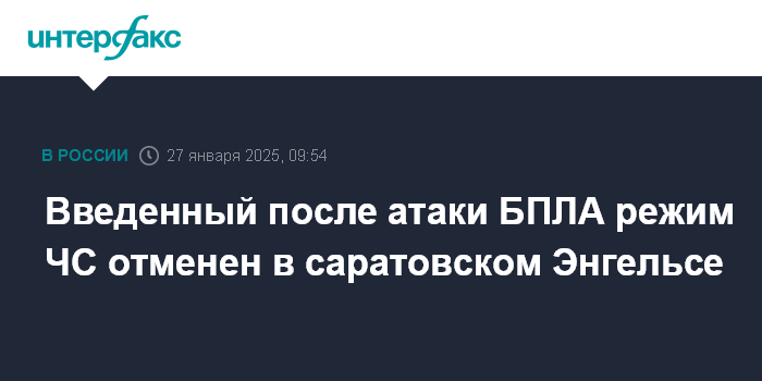 "Отменить с 10.00 (9:00 по Москве - ИФ) 27 января 2025 года режим "Чрезвычайная ситуация". (...) Ввести с 10.00 27 января 2025 года для органов управления и сил Энгельсского муниципального звена Саратовской территориальной подсистемы единой государственной системы предупреждения и ликвидации чрезвычайных ситуаций режим функционирования "Повышенная готовность", - говорится в опубликованном на сайте постановлении главы муниципального района Михаила Исаева.