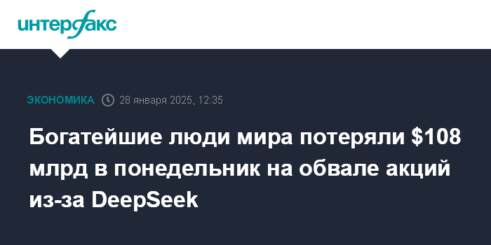 Москва. 28 января. INTERFAX.RU - Состояние 500 самых богатых людей мира в понедельник сократилось в общей сложности на $108 млрд на фоне падения фондовых индексов на опасениях конкуренции со стороны китайского ИИ-стартапа DeepSeek.