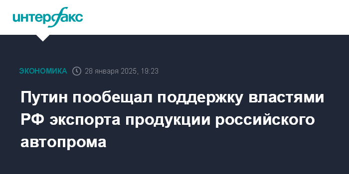 Москва. 28 января. INTERFAX.RU - Президент РФ Владимир Путин пообещал, что власти будут поддерживать экспорт продукции российского автопрома, Россия в этом заинтересована.