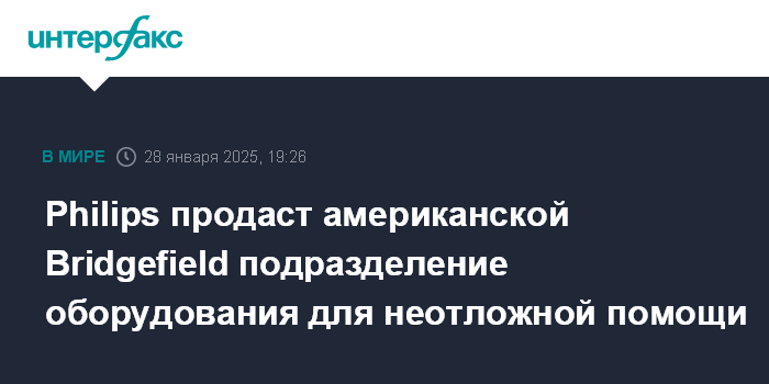 Москва. 28 января. INTERFAX.RU - Нидерландская Royal Philips NV продает подразделение по выпуску медицинского оборудования для неотложной помощи (Emergency Care) американской инвесткомпании Bridgefield Capital.