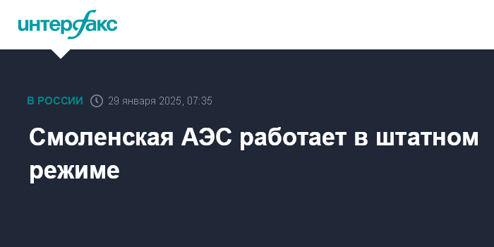 Москва. 29 января. INTERFAX.RU - Смоленская атомная электростанция работает в штатном режиме, сообщили в официальном телеграм-канале станции в среду.