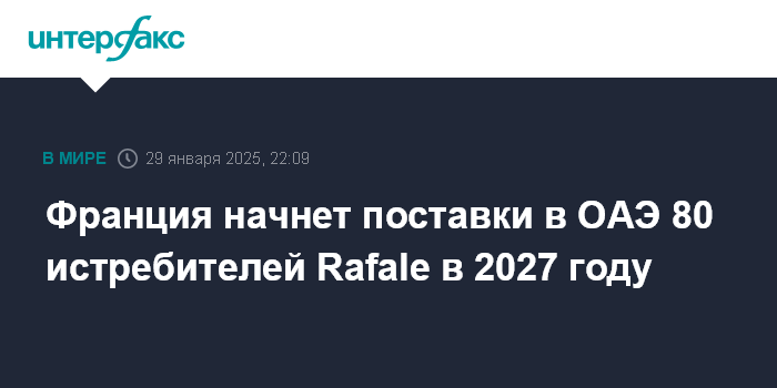 Москва. 29 января. INTERFAX.RU - Франция начнет в 2027 году осуществлять поставки истребителей Rafale для вооруженных сил ОАЭ, сообщил в среду министр обороны Франции Себастьян Лекорню.