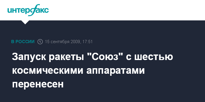 Москва. 15 сентября. INTERFAX.RU - Запланированный на вечер вторника запуск ракеты-носителя "Союз-2.1б" с метеоспутником "Метеор-М" и еще пятью космическими аппаратами отложен, сообщили "Интерфаксу-АВН" в Роскосмосе.