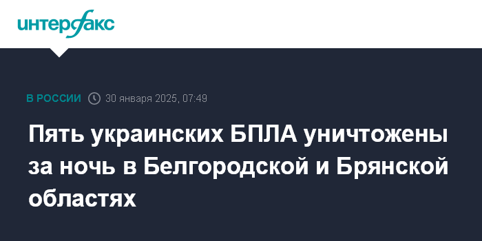 Москва. 30 января. INTERFAX.RU - Российские военные сбили в ночь на четверг пять украинских беспилотников над российскими регионами, сообщили в Минобороны РФ.