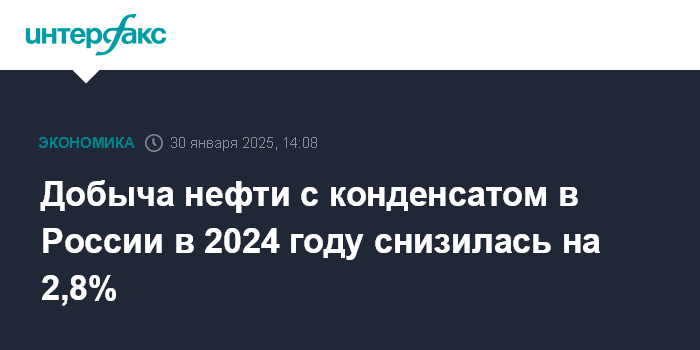 Добыча нефти с конденсатом в России в 2024 году снизилась на 2,8%