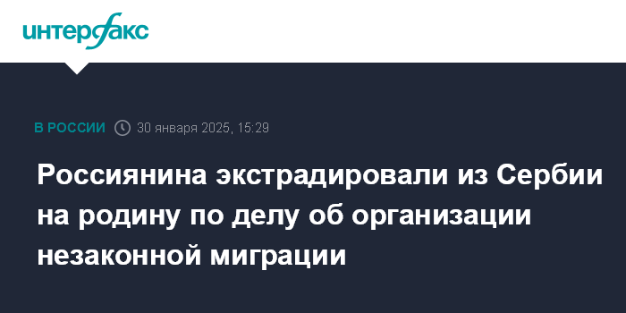 Москва. 30 января. INTERFAX.RU - Сербия выдала россиянина, обвиняемого в организации незаконной миграции, сообщила официальный представитель МВД РФ Ирина Волк в четверг.