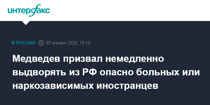 Москва. 30 января. INTERFAX.RU - Иностранные граждане, у которых выявлены опасные болезни или наркотическая зависимость, должны незамедлительно выдворяться из России, нужно исключить любую возможность получения ими российского гражданства, заявил замглавы Совбеза РФ Дмитрий Медведев.