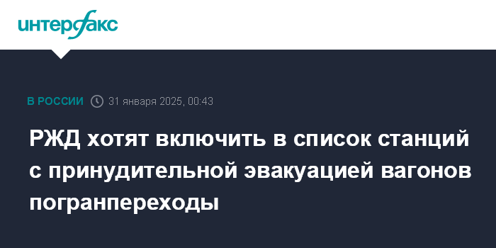 Москва. 31 января. INTERFAX.RU - ОАО "РЖД" хочет включить в список станций с принудительной эвакуацией вагонов погранпереходы и компании непрерывного цикла, сообщил журналистам заместитель генерального директора РЖД - начальник центральной дирекции управления движением Михаил Глазков.