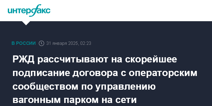 Москва. 31 января. INTERFAX.RU - ОАО "РЖД" рассчитывает на скорейшее подписание договора с операторским сообществом по управлению вагонным парком на сети, сообщил журналистам замглавы РЖД - начальник центральной дирекции управления движением Михаил Глазков.