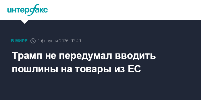 Москва. 1 февраля. INTERFAX.RU - Президент США Дональд Трамп заявил, что по-прежнему планирует ввести пошлины на товары, импортируемые из Евросоюза.