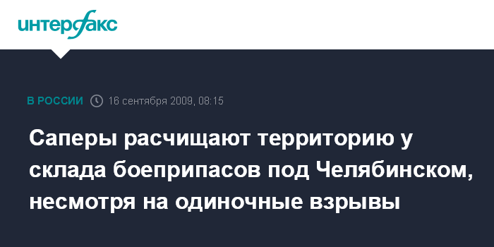 Москва. 16 сентября. INTERFAX.RU - Саперы подразделения Чебаркульской дивизии приступили к расчистке территории вокруг воинской части около города Карабаш (Челябинская область), где в результате пожара на складе боеприпасов начали взрываться артиллерийские снаряды.