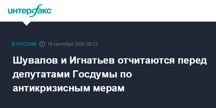 Москва. 16 сентября. INTERFAX.RU - Первый вице-премьер РФ Игорь Шувалов и глава ЦБ Сергей Игнатьев представят в среду депутатам Госдумы отчет правительства и информацию ЦБ РФ о реализации мер по поддержке финансового рынка, банковской системы, рынка труда, отраслей экономики РФ, соцобеспечению населения и других мер социальной политики за четвертый квартал 2008 года и первое полугодие 2009 года.
