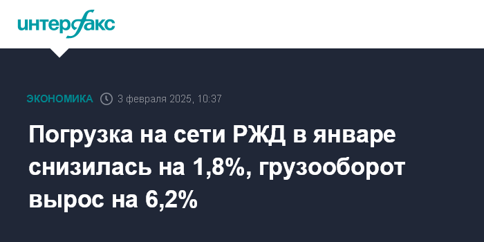 Ранее в понедельник источник, знакомый с деятельностью компании, сообщил "Интерфаксу", что среднесуточная погрузка на сети РЖД в январе 2025 года снизилась на 1,8% по сравнению с январем 2024 года, до 3002,3 тысячи тонн.