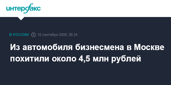 Москва. 16 сентября. INTERFAX.RU - На севере столицы из машины директора коммерческой компании трое злоумышленников в масках похитили около 4,5 млн рублей, сообщил в среду "Интерфаксу" источник в правоохранительных органах города.