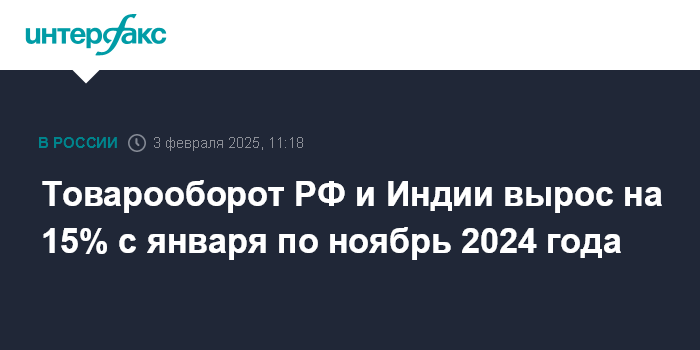 Товарооборот РФ и Индии вырос на 15% с января по ноябрь 2024 года