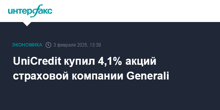 Москва. 3 февраля. INTERFAX.RU - Итальянский банк UniCredit SpA приобрел 4,1% акций страховой компании Assicurazioni Generali SpA.