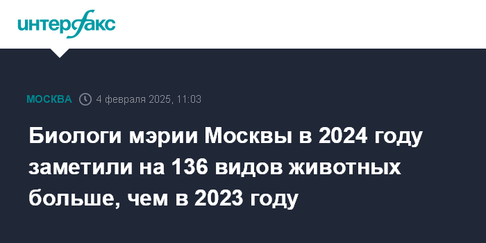 Москва. 4 февраля. INTERFAX.RU - Биологи Департамента природопользования Москвы в 2024 году зафиксировали на 136 видов животных больше, чем годом ранее, а всего 408 видов, в том числе краснокнижных. Об этом сообщил сайт мэрии.