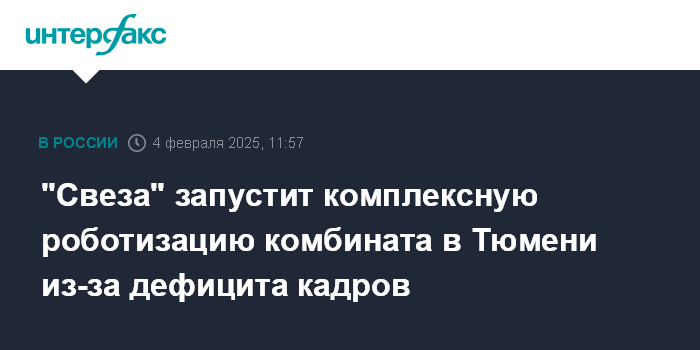"Интерфаксу" в пресс-службе одной из главных причин внедрения роботов назвали дефицит кадров. Предприятие в Тюмени станет "пилотом комплексной роботизации производства с охватом многих процессов, локально в процессы на других комбинатах роботы внедряются тоже".