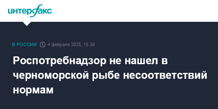 Москва. 4 февраля. INTERFAX.RU - Сотрудники Роспотребнадзора провели более тысячи исследований рыбной продукции из Черного моря, несоответствий гигиеническим нормативам не выявлено, сообщили в ведомстве.