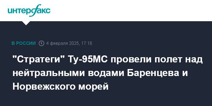 Москва. 4 февраля. INTERFAX.RU - Два стратегических ракетоносца Ту-95МС выполнили плановый полет над нейтральными водами Баренцева и Норвежского морей, на отдельных этапах их сопровождали иностранные истребители, сообщили в Минобороны РФ
