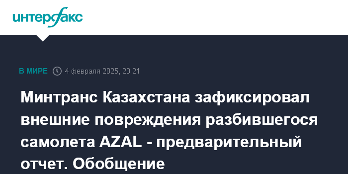 Минтранс Казахстана зафиксировал внешние повреждения разбившегося самолета AZAL - предварительный отчет. Обобщение