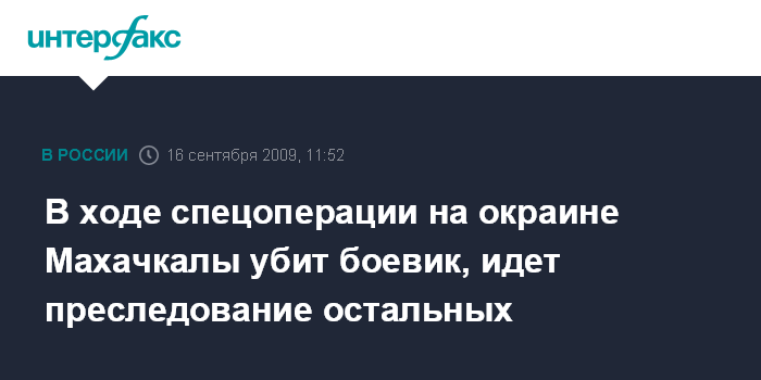 Махачкала. 16 сентября. INTERFAX.RU - Один участник НВФ ликвидирован в ходе продолжающейся на окраине Махачкалы контртеррористической операции, сообщили "Интерфаксу" в Группе общественных связей (ГОС) УФСБ России по Дагестану. "Пока есть данные об одном убитом боевике, ведется преследование остальных участников бандгруппы. По нашим данным, их осталось двое", - сообщил собеседник агентства.