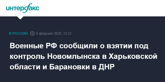 Москва. 5 февраля. INTERFAX.RU - Вооружённые силы России взяли под контроль два населённых пункта - Новомлынск в Харьковской области и Барановку в ДНР, сообщает министерство обороны РФ.