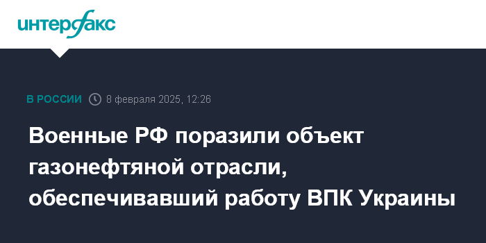Москва. 8 февраля. INTERFAX.RU - Российские военные сообщили, что в течение суток поразили объект газонефтяной отрасли Украины и 93 беспилотника ВСУ.