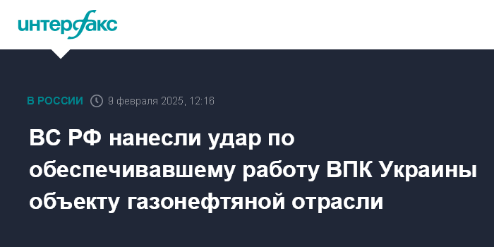 Москва. 9 февраля. INTERFAX.RU - Российские военные сообщили, что поразили объект газонефтяной отрасли, который обеспечивал работу военно-промышленного комплекса (ВПК) Украины.