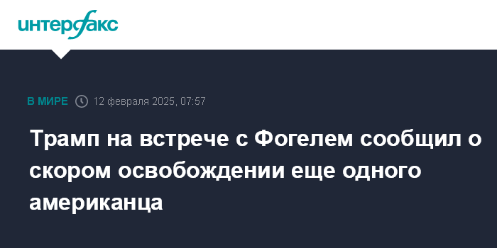 Москва. 12 февраля. INTERFAX.RU - Президент США Дональд Трамп во время встречи в Белом доме с освобожденным в России накануне американским гражданином Марком Фогелем сообщил, что завтра будет освобожден еще один американец.